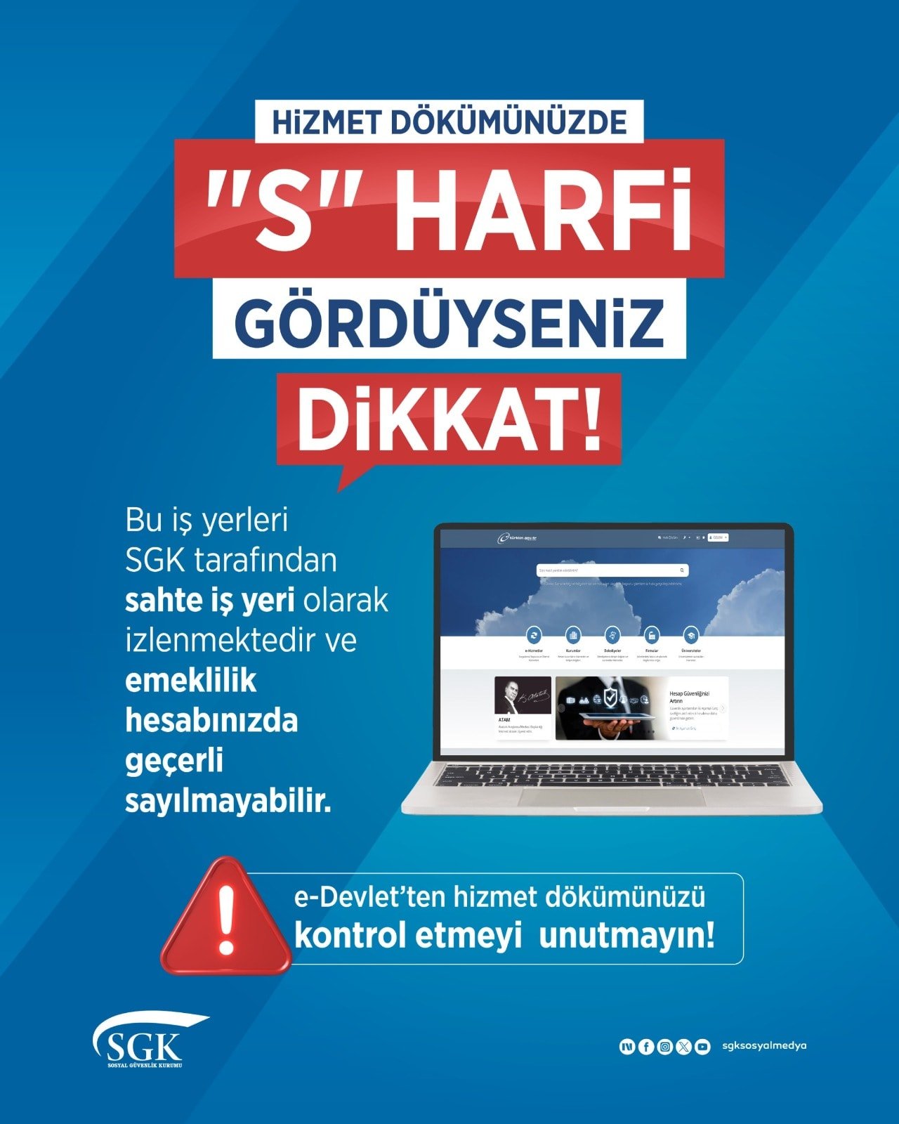 Sosyal Güvenlik Kurumu (SGK), sosyal medya hesabından yaptığı paylaşımda “Hizmet dökümünüzde “S” harfi gördüyseniz dikkat! e-Devlet’ten hizmet dökümünüzü kontrol etmeyi unutmayın!” ifadelerine yer verildi.