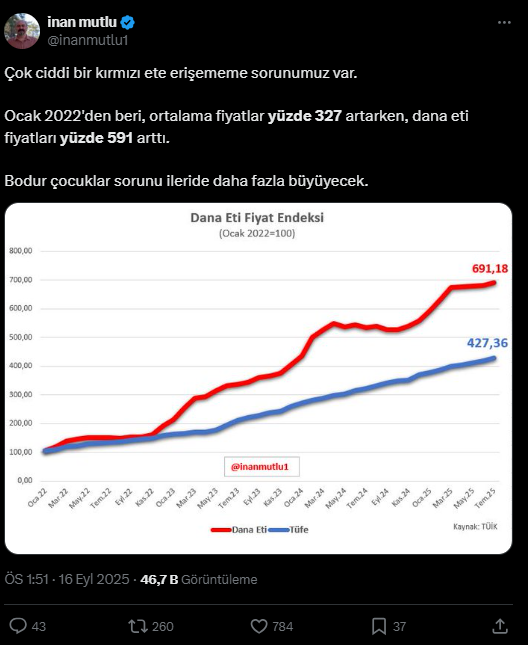 Ekonomist İnan Mutlu’nun yayımladığı verilere göre, Ocak 2022’den bugüne ortalama fiyatlar yüzde 327 artarken, dana eti fiyatlarının yüzde 591 gibi akıl almaz bir seviyeye çıkması dikkat çekiyor. Artış oranları, maaş ve gelir artışlarının çok üzerinde kaldığı için geniş kesimler artık yalnızca ete değil, süt ve süt ürünlerinden temel bakliyata kadar pek çok ürüne ulaşmakta zorlanıyor.