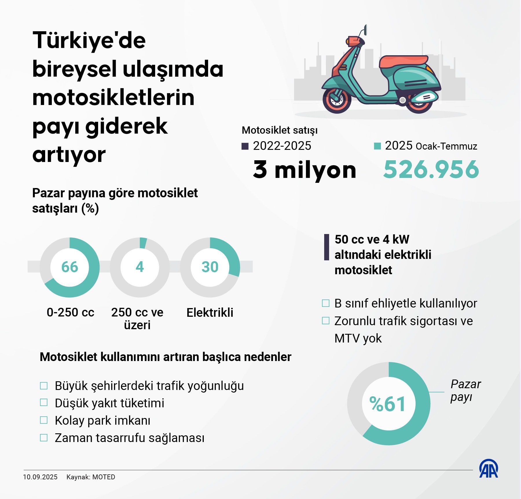 Türkiye’de bireysel ulaşımda motosikletlerin payı giderek artarken, son yıllarda özellikle büyük şehirlerde trafik yoğunluğu, düşük yakıt tüketimi, kolay park imkanı ve zaman tasarrufu sağlaması motosiklet kullanımını artıran başlıca nedenler arasında öne çıkıyor.