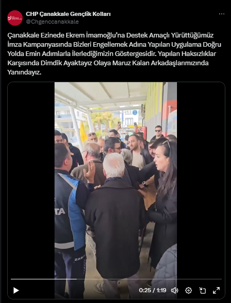 Çanakkale’nin AKP’li Ezine Belediyesi’ne bağlı zabıta ekipleri, Cumhurbaşkanı adayı Ekrem İmamoğlu’nu destek için CHP Gençlik Kolları başkanı tarafından kurulan imza standını kaldırmak isteyince ekipler ile CHP’liler arasında arbede yaşandı.