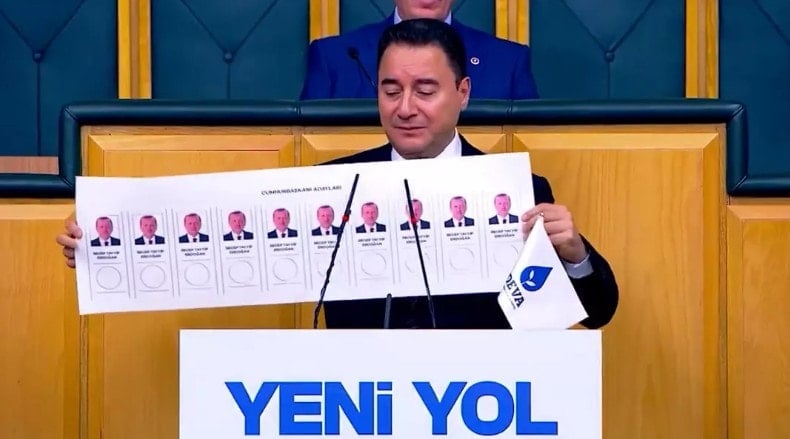 DEVA Partisi lideri Babacan, grup toplantısında Erdoğan’ın fotoğraflarının yer aldığı bir oy pusulası göstererek “İktidarın hayallerindeki, rüyalarındaki oy pusulası bu” ifadelerini kullandı.