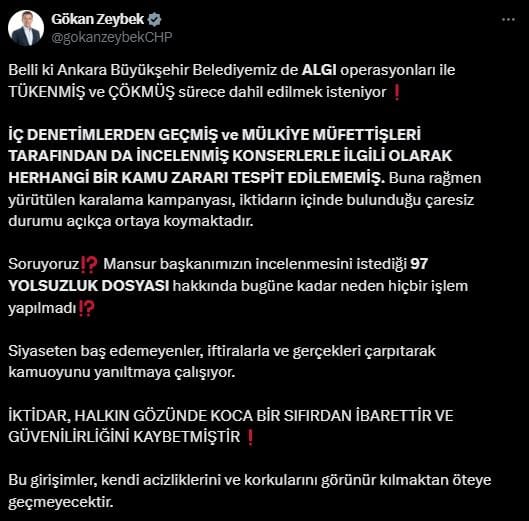 “Belli ki Ankara Büyükşehir Belediyemiz de algı operasyonları ile tükenmiş ve çökmüş sürece dahil edilmek isteniyor. İç denetimlerden geçmiş ve mülkiye müfettişleri tarafından da incelenmiş konserlerle ilgili herhangi bir kamu zararı tespit edilememiş. Buna rağmen yürütülen karalama kampanyası, iktidarın içinde bulunduğu çaresiz durumu açıkça ortaya koymaktadır.