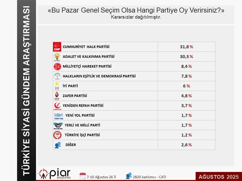 Piar Araştırma’nın 7-10 Ağustos tarihinde yaptığı ankette; CHP’nin oy oranı yüzde 31,8 olarak hesaplanırken, AKP’nin oy oranı yüzde 30,3 olarak açıklanmıştı.