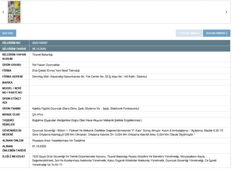 Ticaret Bakanlığı, 8 Ekim 2025 tarihli açıklamasında, “kaktüs figürlü, dans eden, şarkı söyleyen ve şarjlı elektronik özellikli oyuncak” ürününü çocuklar için boğulma riski taşıdığı gerekçesiyle güvensiz ürün ilan etti.