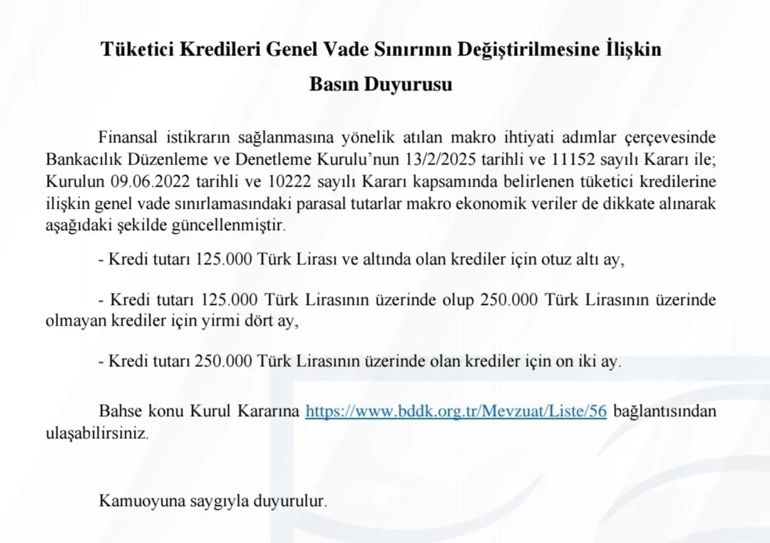 Bankacılık Düzenleme ve Denetleme Kurulu’nun 13/2/2025 tarihli ve 11152 sayılı Kararı ile; Kurulun 09.06.2022 tarihli ve 10222 sayılı Kararı kapsamında belirlenen tüketici kredilerine ilişkin genel vade sınırlamasındaki parasal tutarlar makro ekonomik veriler de dikkate alınarak aşağıdaki şekilde güncellenmiştir.