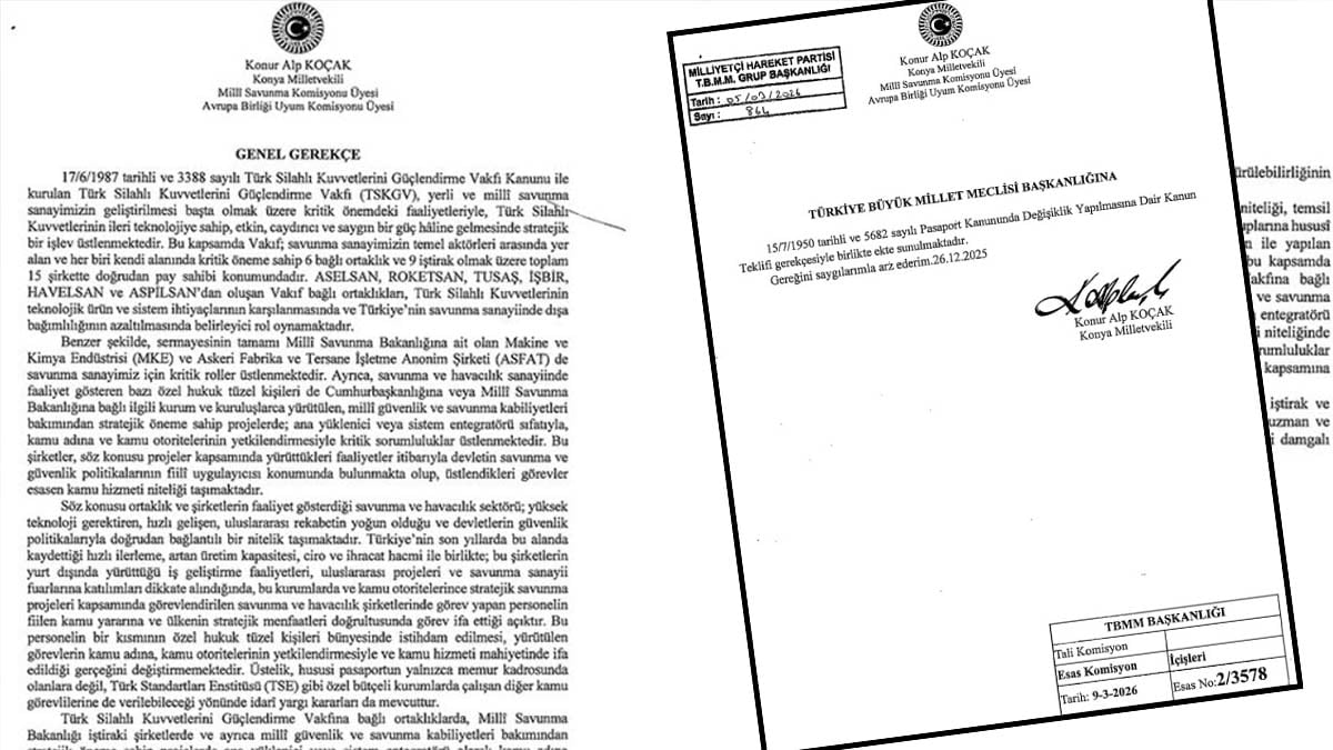 MHP Konya Milletvekili Konur Alp Koçak, savunma ve havacılık sanayiinde görev yapan nitelikli personelin belirli şartlar altında hususi damgalı (yeşil) pasaport alabilmesini öngören kanun teklifini TBMM Başkanlığı’na sundu.