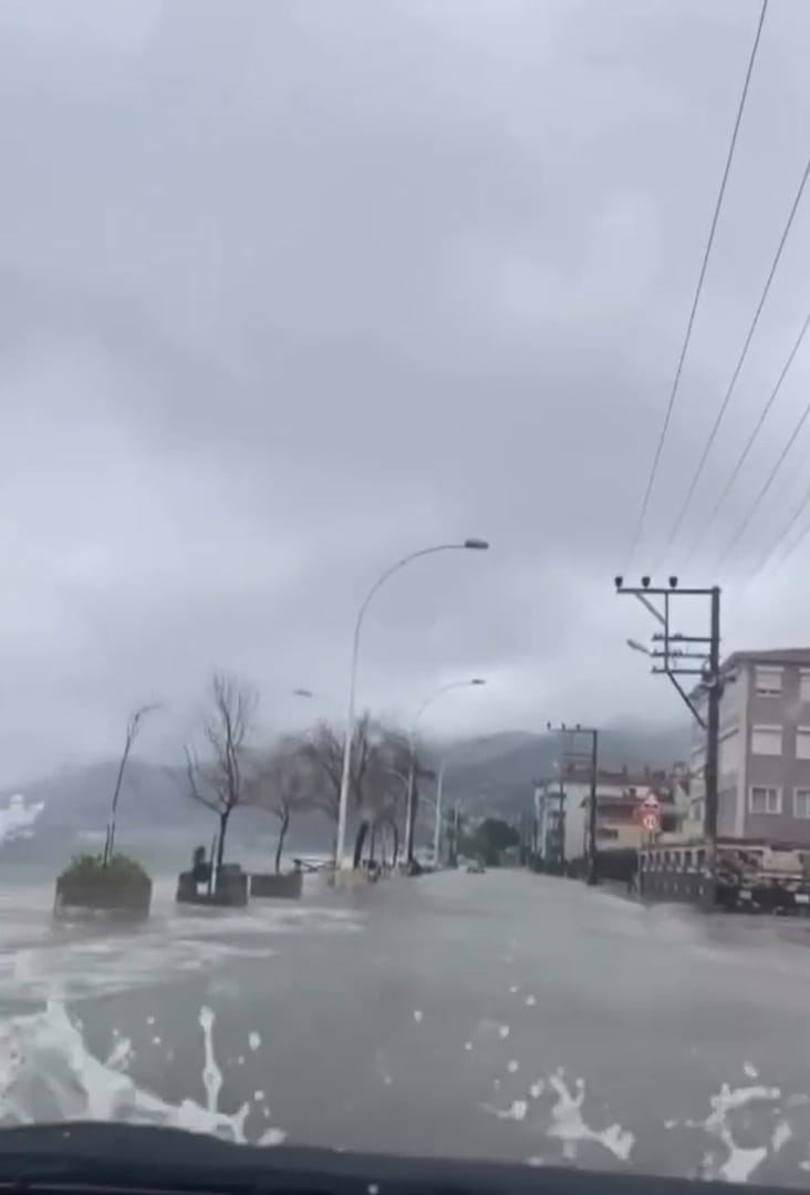 Bursa’nın Gemlik ilçesi Kurşunlu Mahallesi’nde sabah saatlerinde başlayan hava muhalefeti, kıyı şeridinde zor anlar yaşanmasına neden oldu. Fırtınanın hızı ve kuvvetli yağışın etkisiyle yükselen dalgalar, sahil şeridini aşarak yola ulaştı. Kurşunlu Sahili’nde denizin karayla birleştiği anlar, bölgedeki yaşamı doğrudan etkiledi.