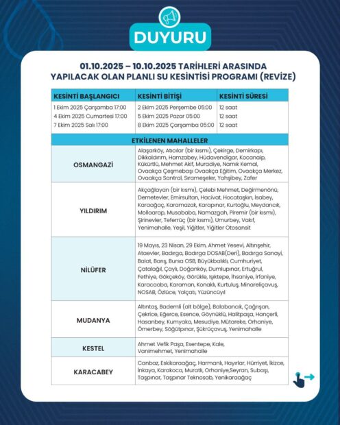 Söz konusu planlı su kesintileri, günlük 12 saati geçmemek kaydıyla, merkez ilçelere bağlı mahallelerde dönüşümlü olarak uygulanacaktır. Yapılması planlanan su kesintileri ile günlük 100 bin metreküp su tasarrufu yapılması hedeflenmektedir. Planlı su kesintilerinden, Uludağ Üniversitesi, Şehir Hastanesi ve Devlet Hastaneleri etkilenmeyecektir. Planlı su kesinti listesi ekte sunulmuştur” denildi.