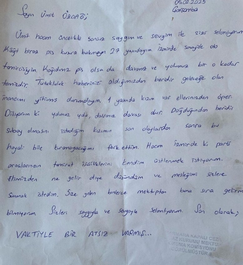 Tutuklu bulunan Zafer Partisi lideri Ümit Özdağ, 27 yaşında oto tamircisi Mehmet isimli bir gencin cezaevine gönderdiği mektubu paylaştı.