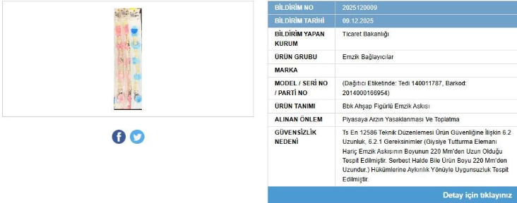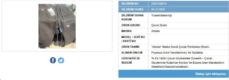 Ticaret Bakanlığı’nın son denetimlerinde çocuklara yönelik iki üründe sağlık riski tespit edildi. Güvensiz Ürün Bilgi Sistemi’nde yayımlanan listeye göre bir çocuk pantolonu ile bir emzik askılığı hem yasaklandı hem de piyasadan toplatılmak üzere işlem başlatıldı.