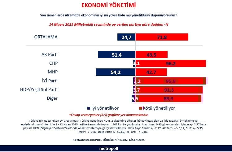 Diğer partilere oy veren seçmenlerin de yüzde 89,9’u ekonomi yönetimini kötü bulduğunu söyledi.