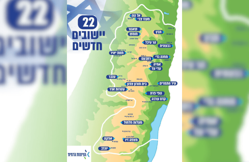 İsrail tarafından paylaşılan, kurulan 22 illegal yerleşim yerinin işaretlendiği haritaAynı zamanda işgal altındaki bölgede kurulacak 22 yerleşim biriminin bulunduğu bir harita da yayımlandı.