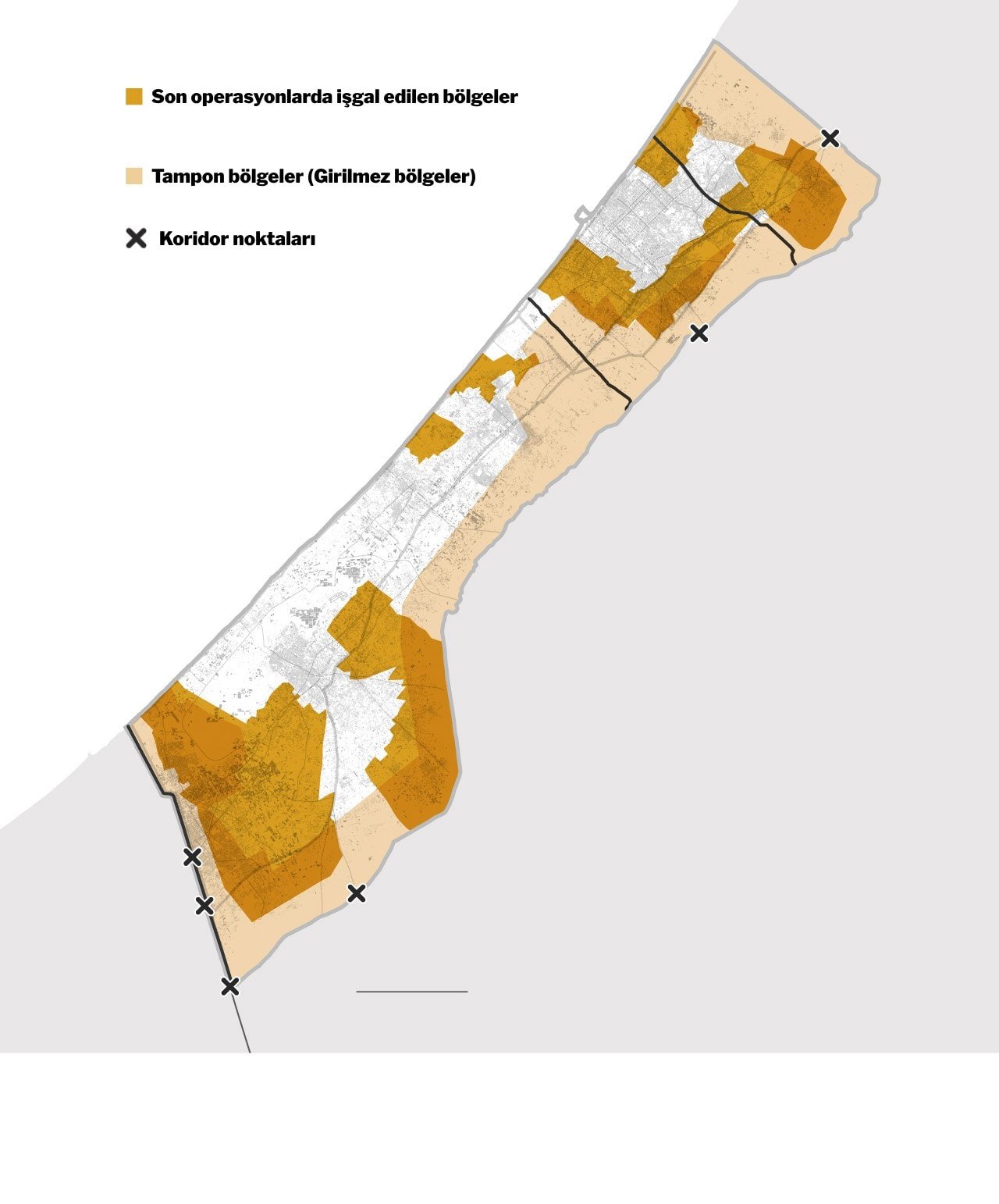 İsrail aynı zamanda Gazze’nin İsrail ve Mısır sınırları boyunca uzanan “güvenlik bölgesi”ni genişletti. İsrail ordusu bu adımın güvenlik gerekçesiyle atıldığını öne sürüyor. Ancak yetkililer bu bölgelerin geri verilmeyeceğini de açıkça ifade etti.