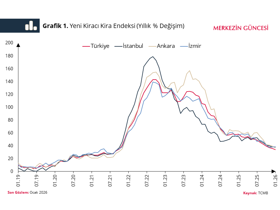 Türkiye Cumhuriyet Merkez Bankası’nın yayımladığı Yeni Kiracı Kira Endeksi, yeni sözleşmelerde artış hızının ocak itibarıyla %34,2’ye gerilediğini ocakta yüzde 3,5, reel olarak 2,7 artış kaydettiğini ortaya koydu.