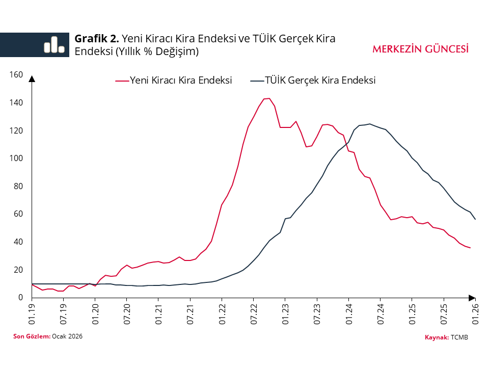 Haberde yer alan bilgilere göre, TÜİK tarafından açıklanan “Gerçek Kira Endeksi”, mevcut kiracıların kontrat yenilemelerini ve %25 zam sınırı gibi geçmiş uygulamaları da kapsadığı için piyasadaki güncel fiyat değişimlerini gecikmeli yansıtıyor. TCMB’nin banka değerleme raporlarından yola çıkarak hazırladığı Yeni Kiracı Kira Endeksi (YKKE) ise, bir konutun o anki piyasa şartlarında hangi bedelle kiraya verilebileceğini ölçüyor.