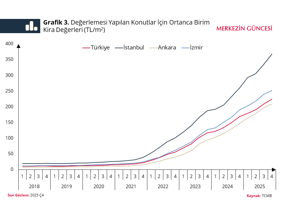 TCMB, endeksin yanı sıra 2025 yılının son çeyreği itibarıyla 100 metrekarelik bir konutun ortanca kira değerlerini de paylaştı.