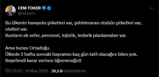 “Bu ülkenin havayolu şirketleri var, şehirlerarası otobüs şirketleri var, otelleri var. Bunların ek sefer, personel, lojistik, tedarik planlamaları var. Ama burası Ortadoğu. Ülkede 2 hafta sonraki bayramın kaç gün tatil olacağını bilen yok. Beyefendi karar verince öğreneceğiz!!”