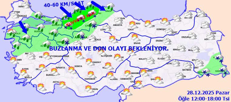 Rüzgarın, kuzey ve kuzeybatı yönlerden kuvvetli (40-60 km/saat) olarak esmesi bekleniyor. Bölgenin iç kesimlerinde buzlanma ve don olayı görüleceği tahmin ediliyor.