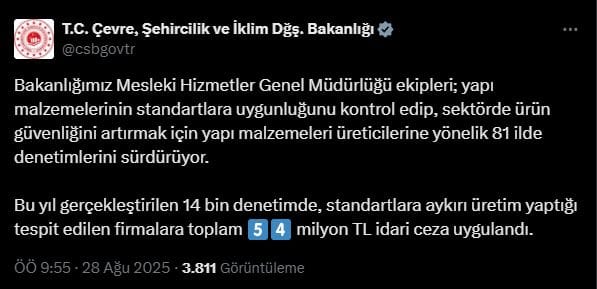 Bakanlığın NSosyal hesabından yapılan açıklamaya göre, Mesleki Hizmetler Genel Müdürlüğü ekipleri, yapı malzemelerinin standartlara uygunluğunu kontrol edip, sektörde ürün güvenliğini artırmak için yapı malzemeleri üreticilerine yönelik 81 ilde denetimlerini sürdürüyor.