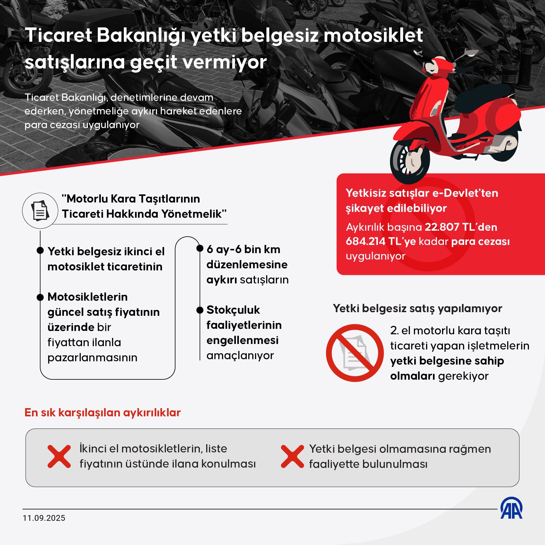 Son dönemdeki denetimlerde ikinci el motosikletlerin, ilan kısıtlamasına aykırı şekilde liste fiyatının üstünde ilana konulması ve yetki belgesi olmamasına rağmen faaliyette bulunulması en çok karşılaşılan aykırılıklar olarak dikkati çekti. Bu durum ilan siteleri üzerinden yürütülen takip ve Bakanlığa iletilen şikayetlerin incelenmesiyle tespit edildi. Aykırılık başına ise 22 bin 807 liradan 684 bin 214 liraya kadar para cezası uygulanıyor.