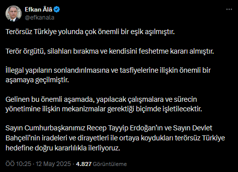 MHP Genel Başkanı Devlet Bahçeli’nin başlattığı sürece ilişkin son olarak 9 Mayıs Cuma günü PKK, 5-7 Mayıs tarihleri arasında kongresini topladığını açıklamış ve bu kongrede “tarihi öneme sahip kararlar alındı” ifadelerini kullanmıştı.