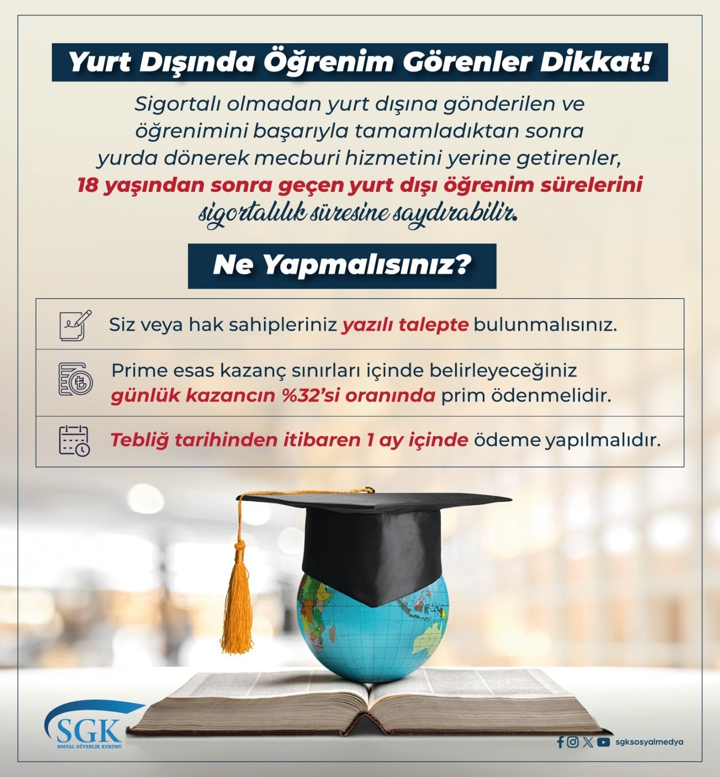 Sosyal Güvenlik Kurumu (SGK), yurt dışında sigortasız olarak öğrenim gören vatandaşlara önemli bir hak tanıdı. Buna göre, kamu göreviyle yurt dışına gönderilen ve eğitimlerini tamamladıktan sonra yurda dönerek mecburi hizmetini yerine getiren kişiler, 18 yaşından sonra geçirdikleri yurt dışı öğrenim sürelerini sigortalılık süresine dahil ettirebilecek.