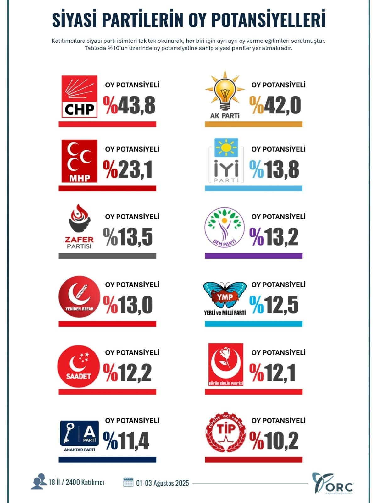 ORC Araştırma tarafından 01-03 Ağustos 2025 tarihleri arasında 18 ilde 2400 katılımcıyla gerçekleştirilen son anket çalışması, siyasi partilerin oy potansiyellerini gözler önüne serdi.