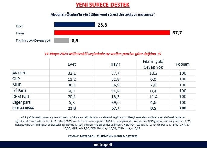 Yapılan ankette katılımcılara ”Abdullah Öcalan’la yürütülen yeni süreci destekliyor musunuz?” sorusu soruldu.