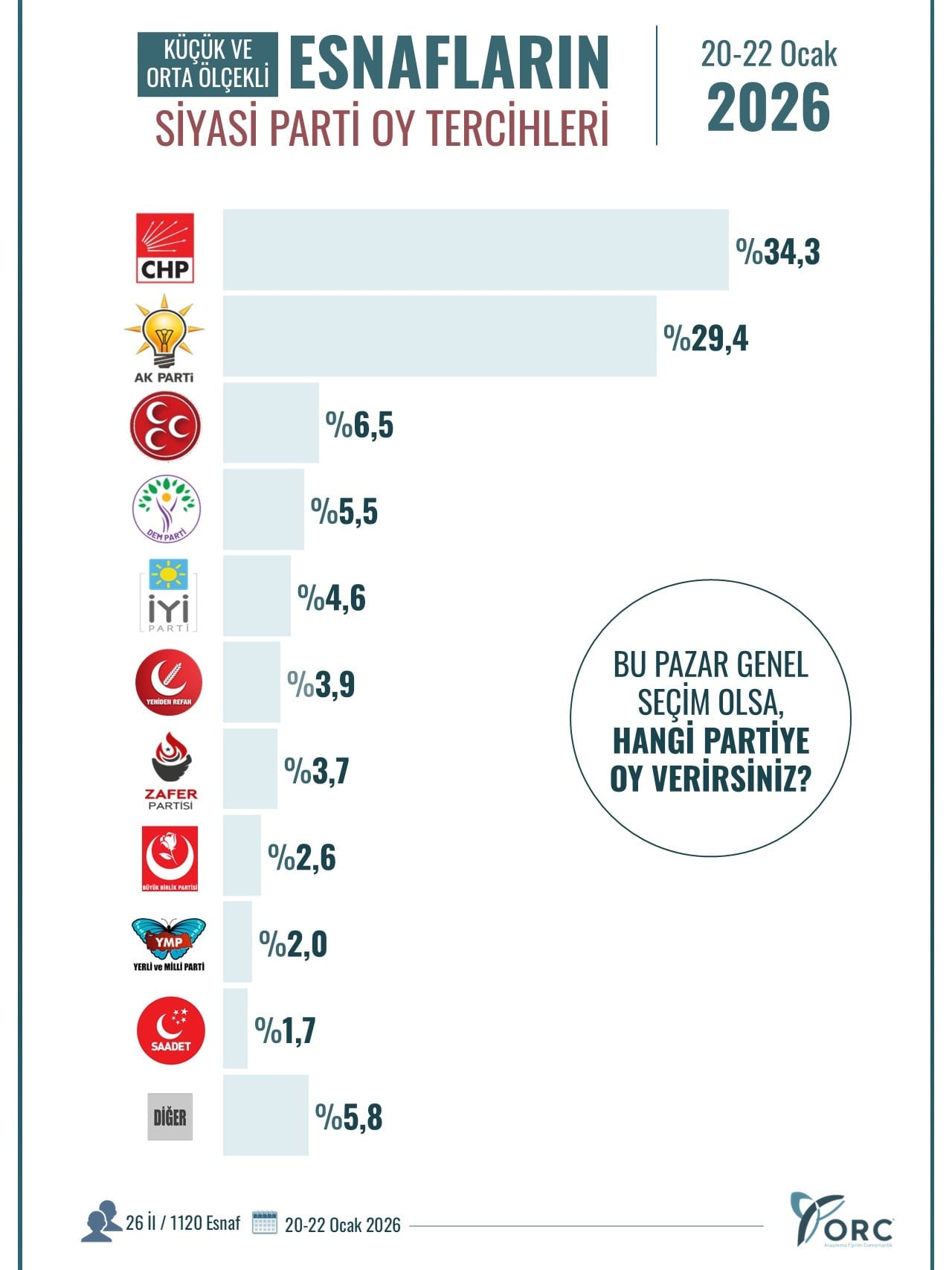 20-22 Ocak tarihleri arasında 26 ilde bin 120 küçük ve orta ölçekli esnafla yapılan ankette, esnaflara, “Bu pazar genel seçim olsa hangi partiye oy verirdiniz” sorusu yöneltildi. Katılımcıların cevaplarına göre CHP yüzde 34,3 ile birinci parti olurken AKP yüzde 29,4 ile ikinci parti oldu.