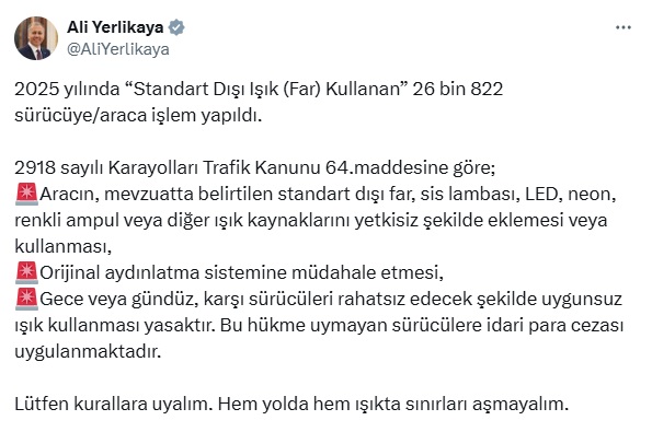 Bakan Yerlikaya, sosyal medya hesabından yaptığı açıklamada, 2025 yılında ‘standart dışı ışık (far) kullanan’ 26 bin 822 sürücüye/araca işlem yapıldığını belirtti. Yerlikaya, şu ifadelere yer verdi:
