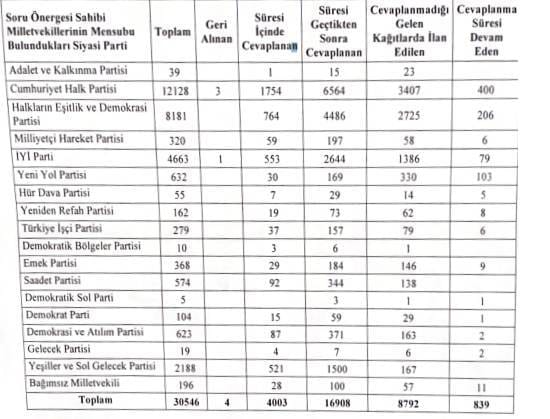 Milletvekilleri arasında soru önergesi verme konusunda CHP açık ara önde yer aldı. CHP’li vekiller tarafından verilen 12 bin 128 önergeden yalnızca 1.754’ü süresi içinde yanıtlandı. Gecikmeli yanıtlanan önerge sayısı 6 bin 564 olurken, 3 bin 407 önergeye ise hiç cevap verilmedi.