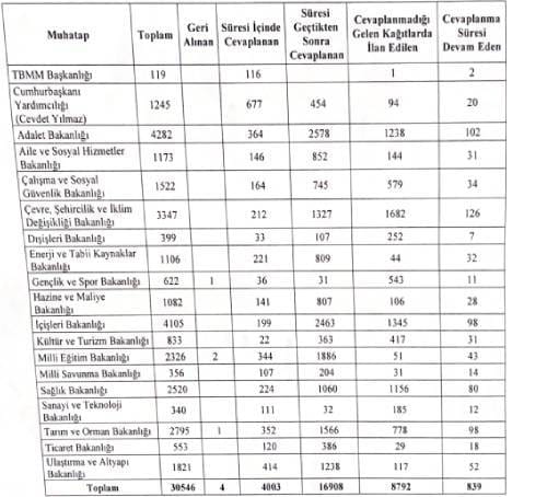 En fazla önergeye muhatap kalan kurum 4 bin 282 önergeyle Adalet Bakanlığı oldu. Bu bakanlığı 4 bin 105 önergeyle İçişleri Bakanlığı ve 3 bin 347 önergeyle Çevre, Şehircilik ve İklim Değişikliği Bakanlığı takip etti.