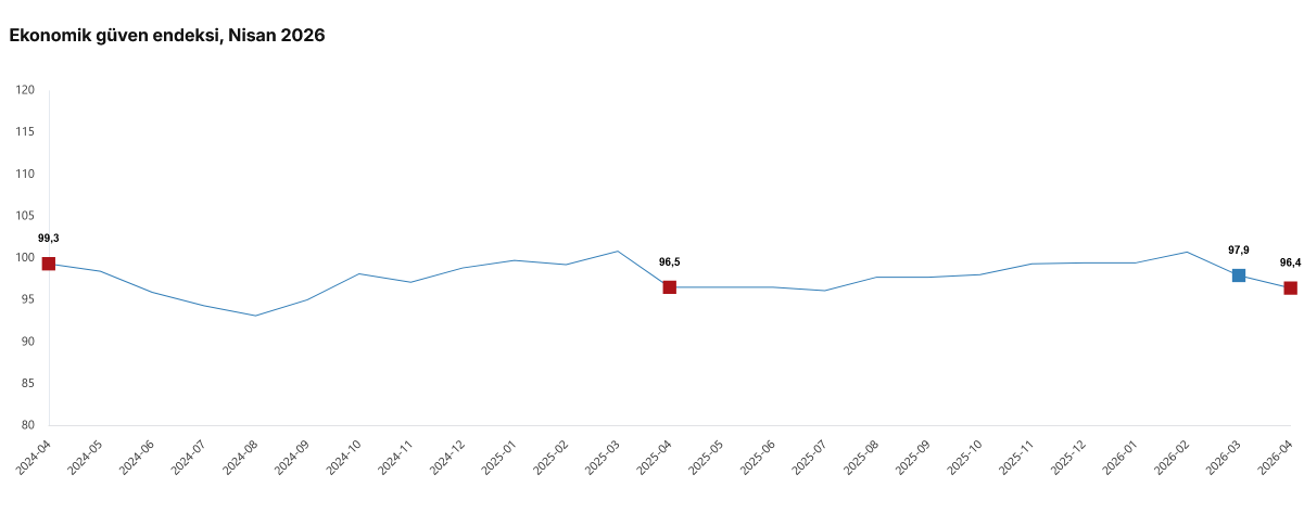 Türkiye İstatistik Kurumu (TÜİK) tarafından açıklanan Nisan 2026 verilerine göre, ekonomik güven endeksi Mart ayındaki 97,9 seviyesinden geriye düşerek 96,4 değerine indi. Aylık bazda yaşanan yüzde 1,5 oranındaki bu azalış, ekonomideki negatif beklentilerin sürdüğünü ortaya koydu.