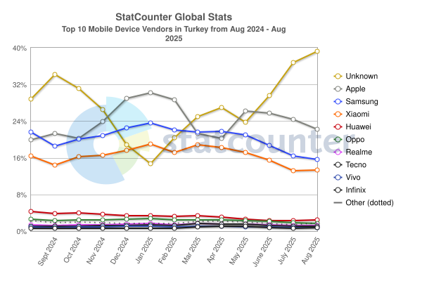 Türkiye akıllı telefon pazarında şaşırtıcı bir tablo ortaya çıktı. Statcounter’ın Ağustos 2025 verilerine göre, en çok kullanılan telefonlar “Unknown” yani “bilinmeyen” kayıt dışı cihazlar oldu.