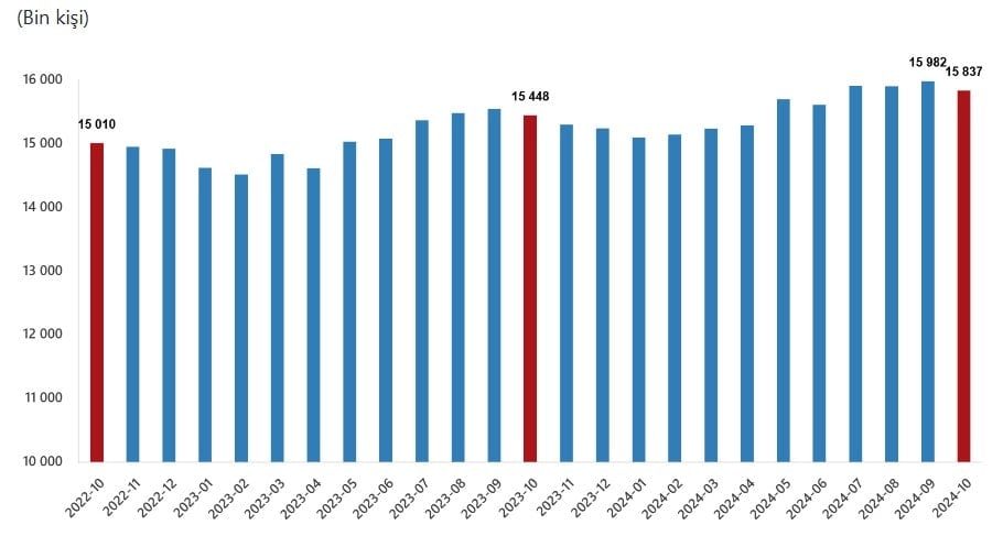 Sanayi, inşaat ve ticaret-hizmet sektörleri toplamında ücretli çalışan sayısı 2024 Ekim ayında bir önceki yılın aynı ayına göre yüzde 2,5 arttı. Ücretli çalışan sayısı bir önceki yılın aynı ayında 15 milyon 448 bin 458 kişi iken, 2024 yılı Ekim ayında 15 milyon 837 bin 471 kişi oldu.