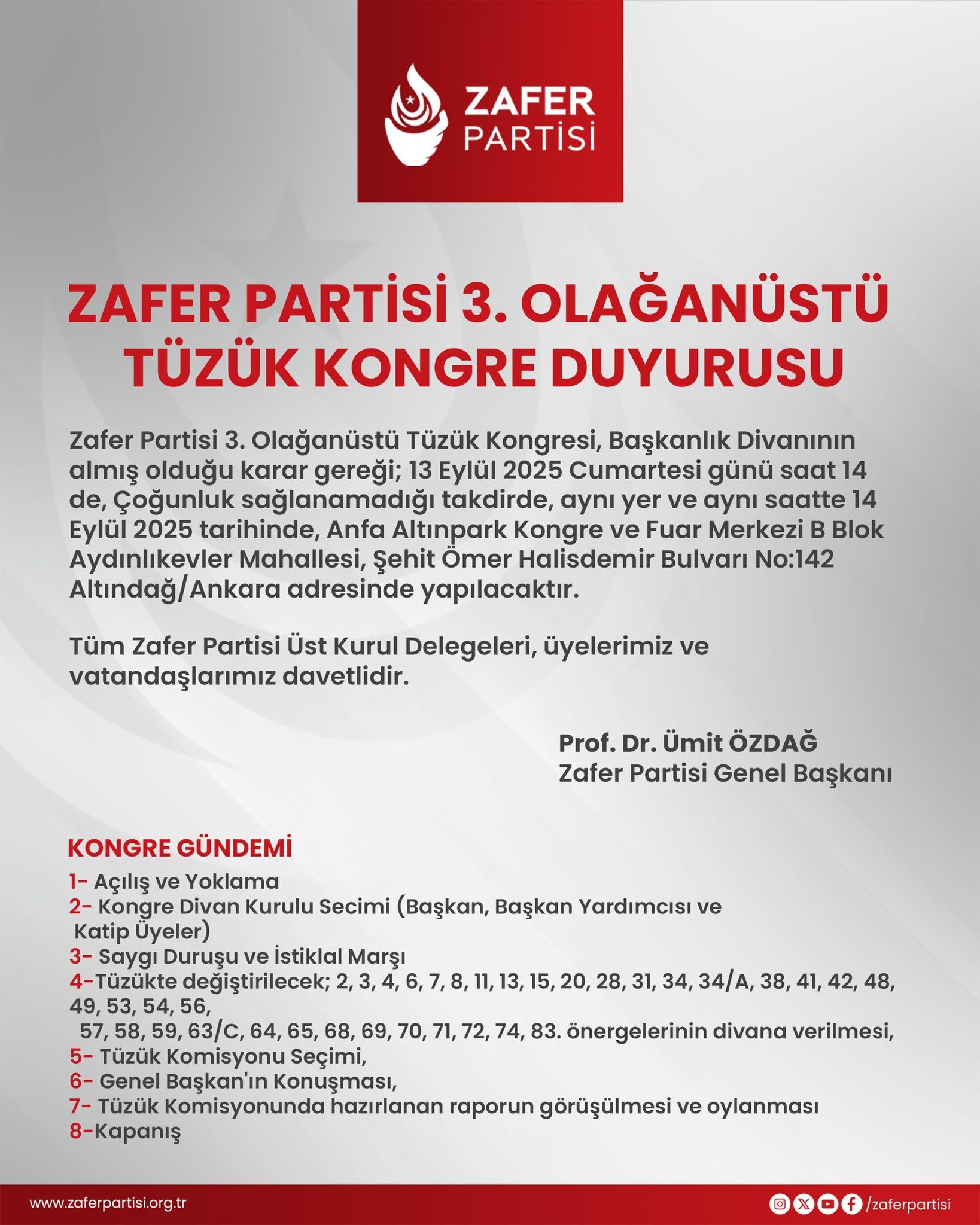Zafer Partisi 3. Olağanüstü Tüzük Kongresi, Başkanlık Divanının almış olduğu karar gereği; 13 Eylül 2025 Cumartesi günü saat 14’te, Çoğunluk sağlanamadığı takdirde, aynı yer ve aynı saatte 14 Eylül 2025 tarihinde, Anfa Altınpark Kongre ve Fuar Merkezi B Blok Aydınlıkevler Mahallesi, Şehit Ömer Halisdemir Bulvarı No:142 Altındağ/Ankara adresinde yapılacaktır.